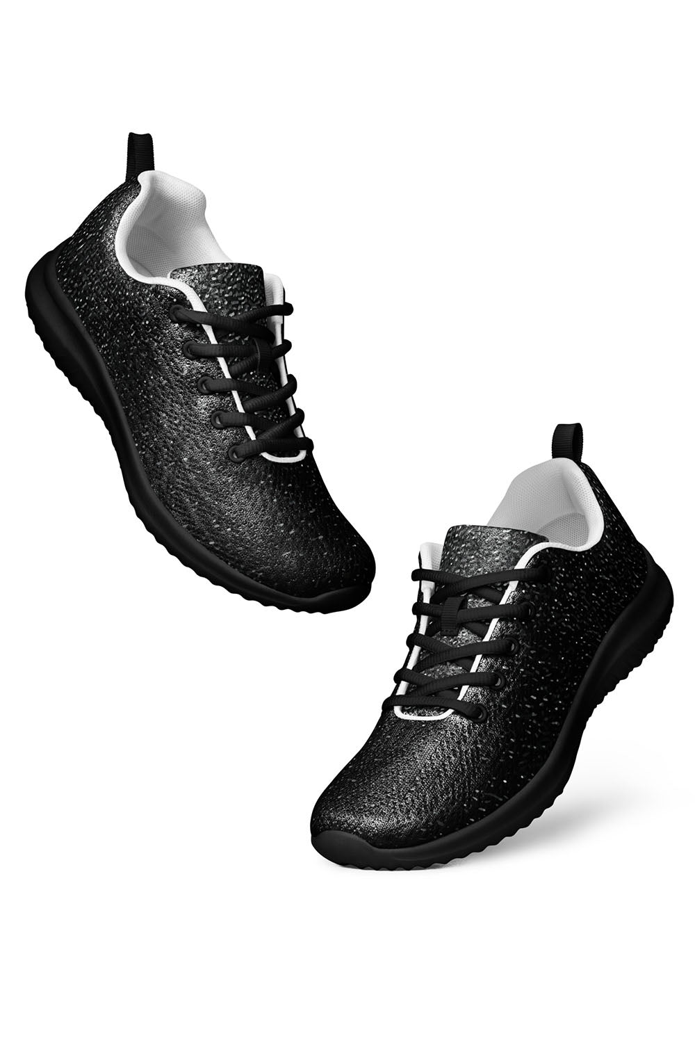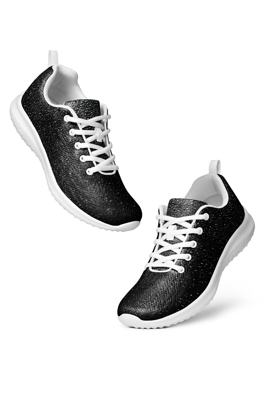 Dark Texture Men's Athletic Shoes - For this artwork we created a dark texture design that spreads across the shoes. To simulate this artwork, we created a solid black base then we scattered white & grey dots/specks all over it to create the texture effect. If you like the texture effect then add these dark texture men's athletic shoes to your wardrobe.