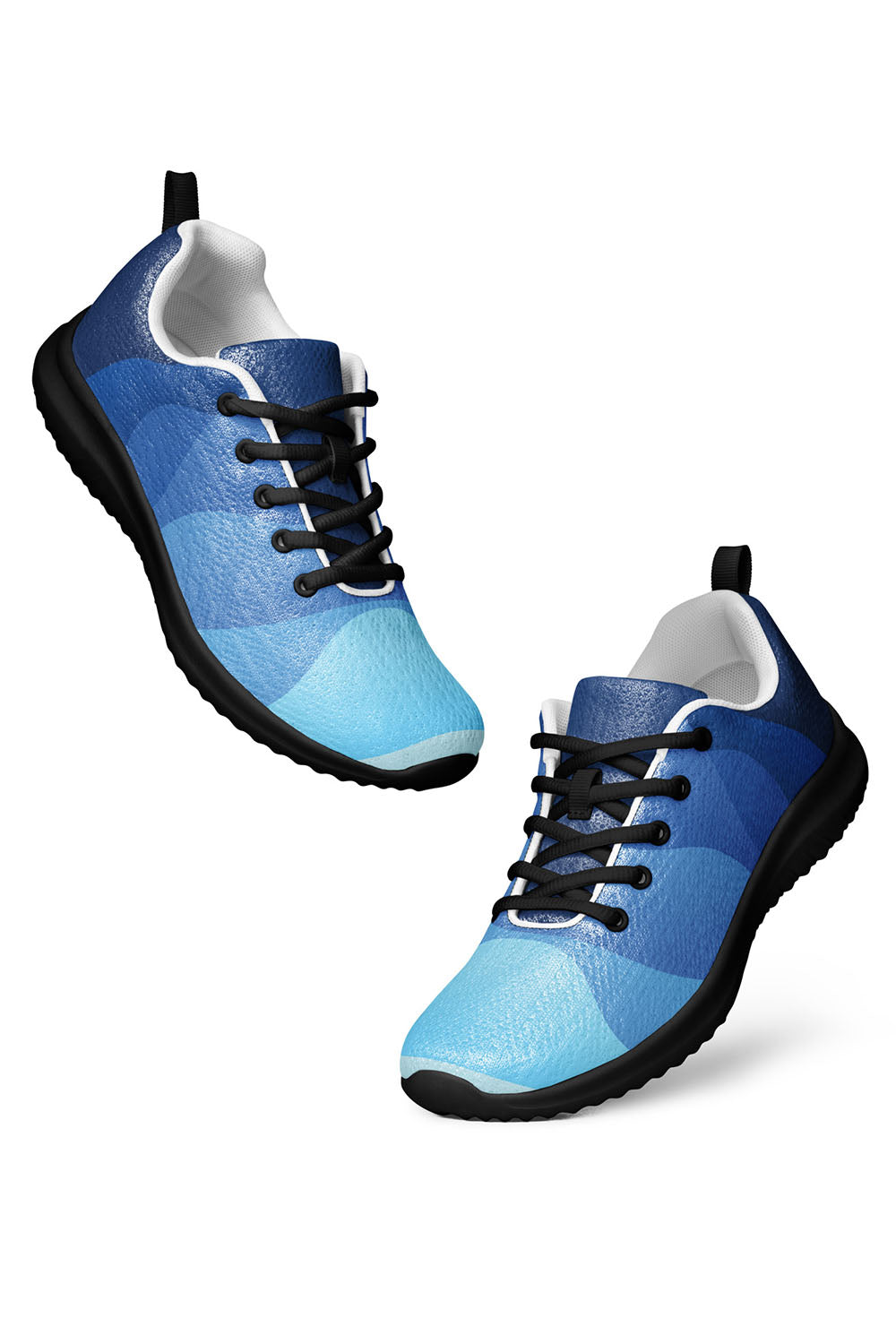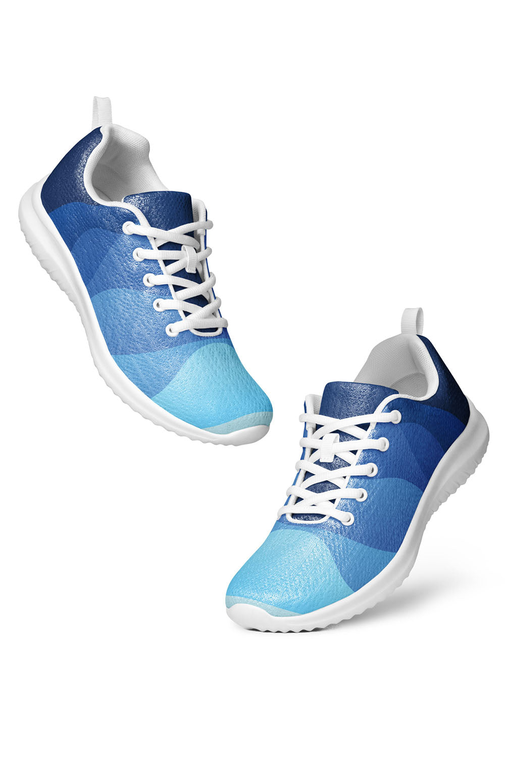 Wavy Men's Athletic Shoes - For this artwork, we created a multi-color waves pattern that ranges from dark blue all the way down to sky blue which spreads across the shoes. These wavy men's athletic shoes are a great addition to your wardrobe. Put them on and take the sea with you wherever you go.