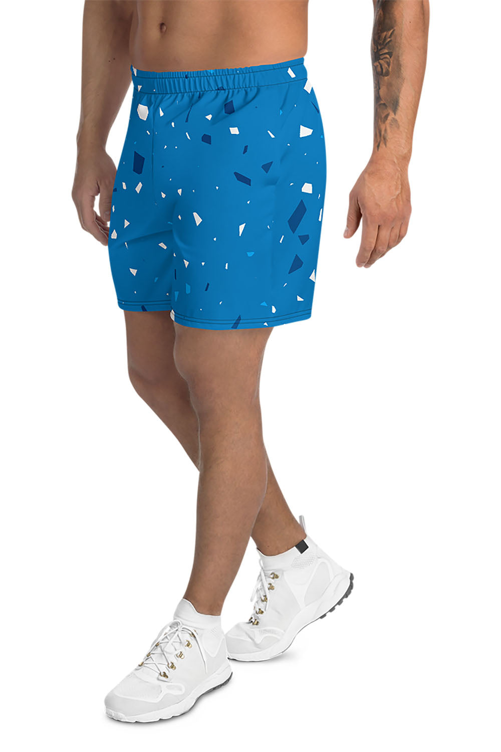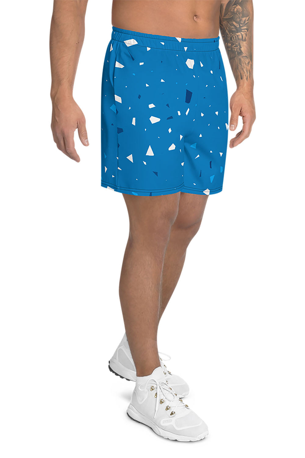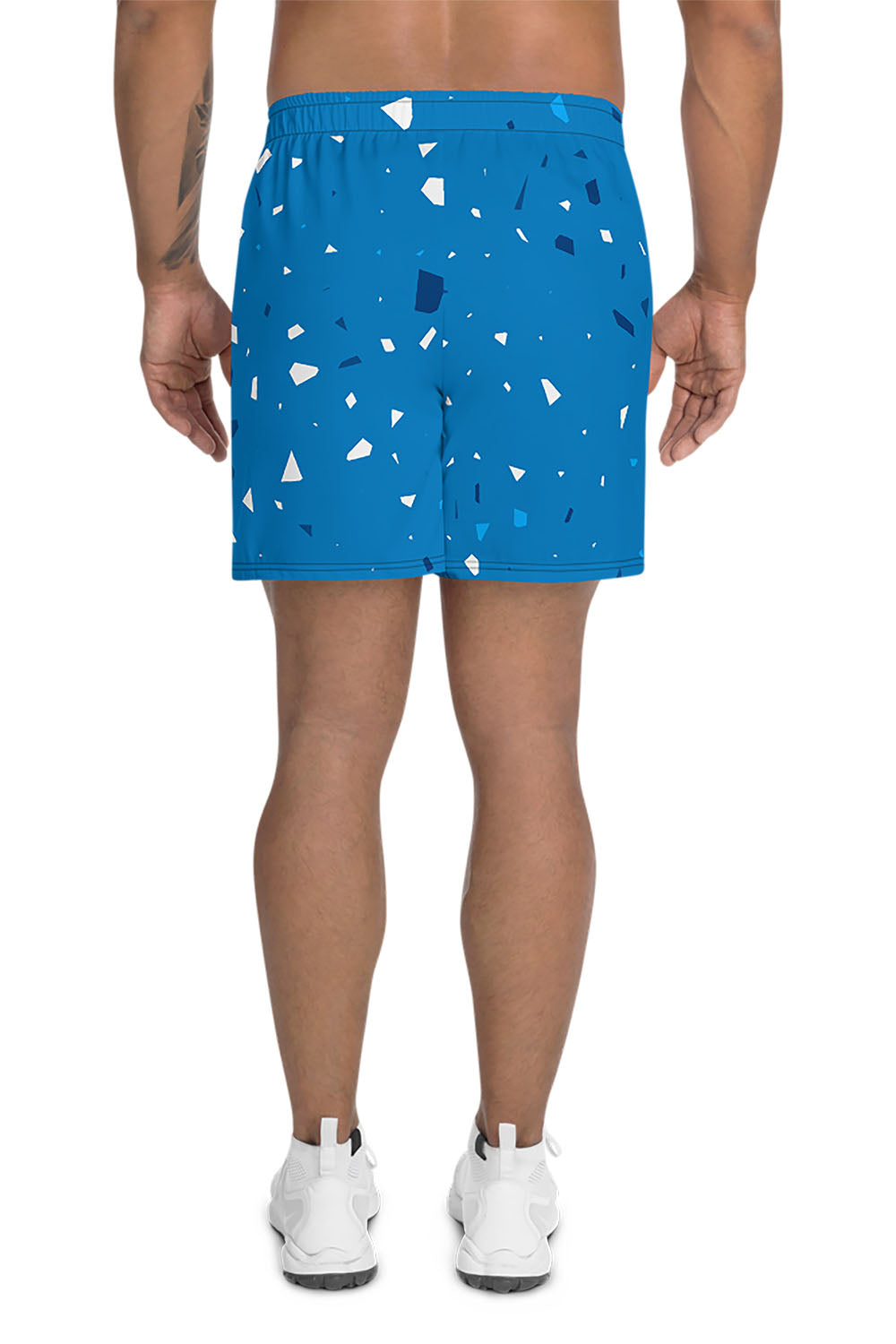 Blue Terrazzo Men's Athletic Shorts - Terrazzo is a composite material that's poured in place or precast which is used for wall and floor treatments. It consists of chips of quartz, marble, glass or granite. It comes in many colors and for this artwork, we chose blue terrazzo. To simulate this artwork, we created a solid blue color base then we scattered multiple geometrical shapes over it to simulate the chips of marble/granite.