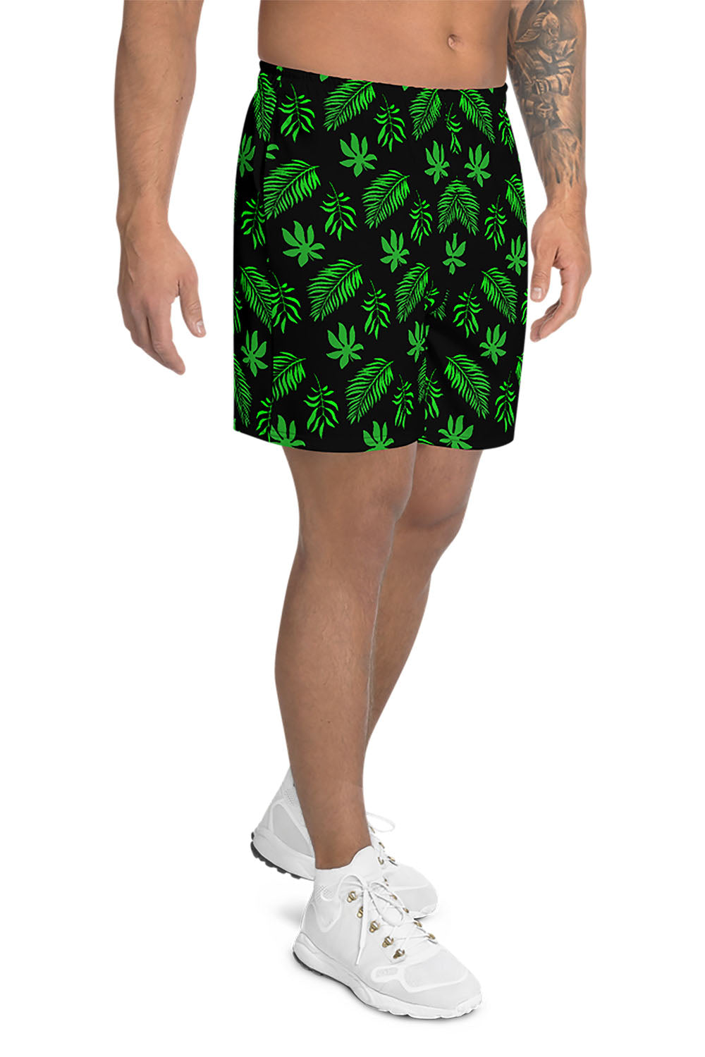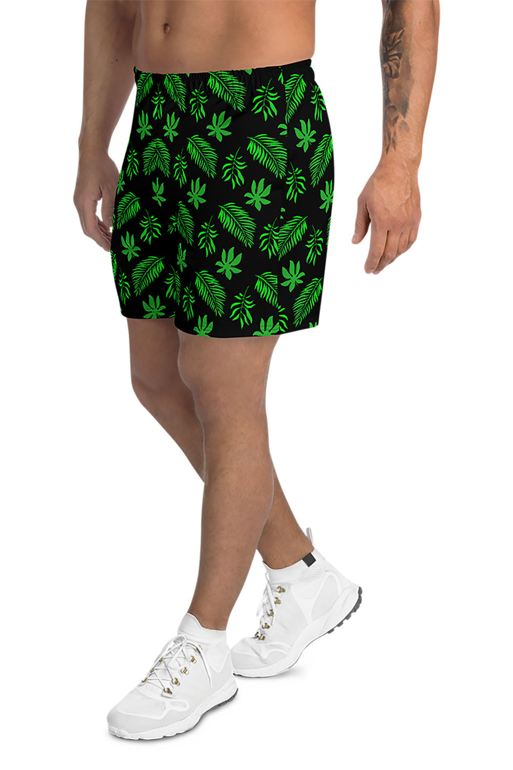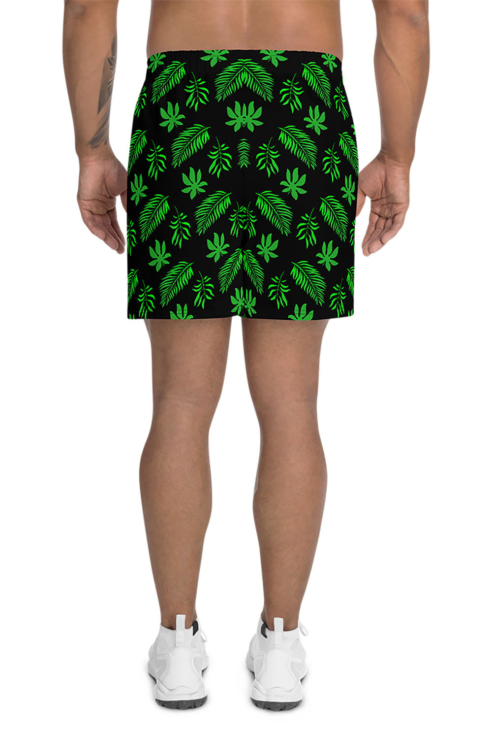 Tropical Men's Athletic Shorts - For this artwork, we chose black as the main color of the shorts because it creates the best contrast against the color of the design and makes it pop. Picking tropical as the name of the shorts was derived from the simulation that the artwork represents. These wonderful tropical tree leaves that are captivating, vibrant, and soothing. Get these tropical men's athletic shorts and add a touch of the tropical island to your wardrobe.