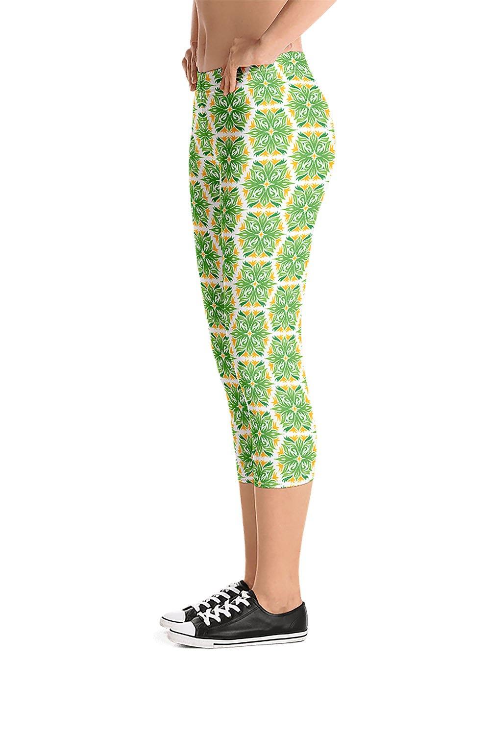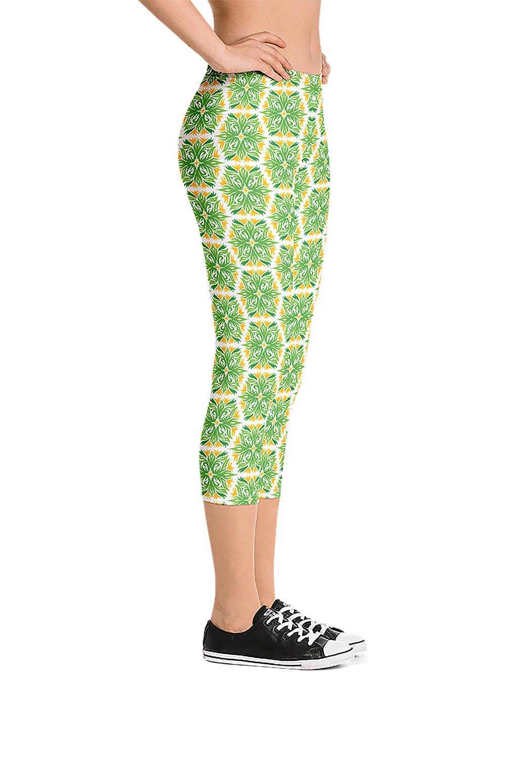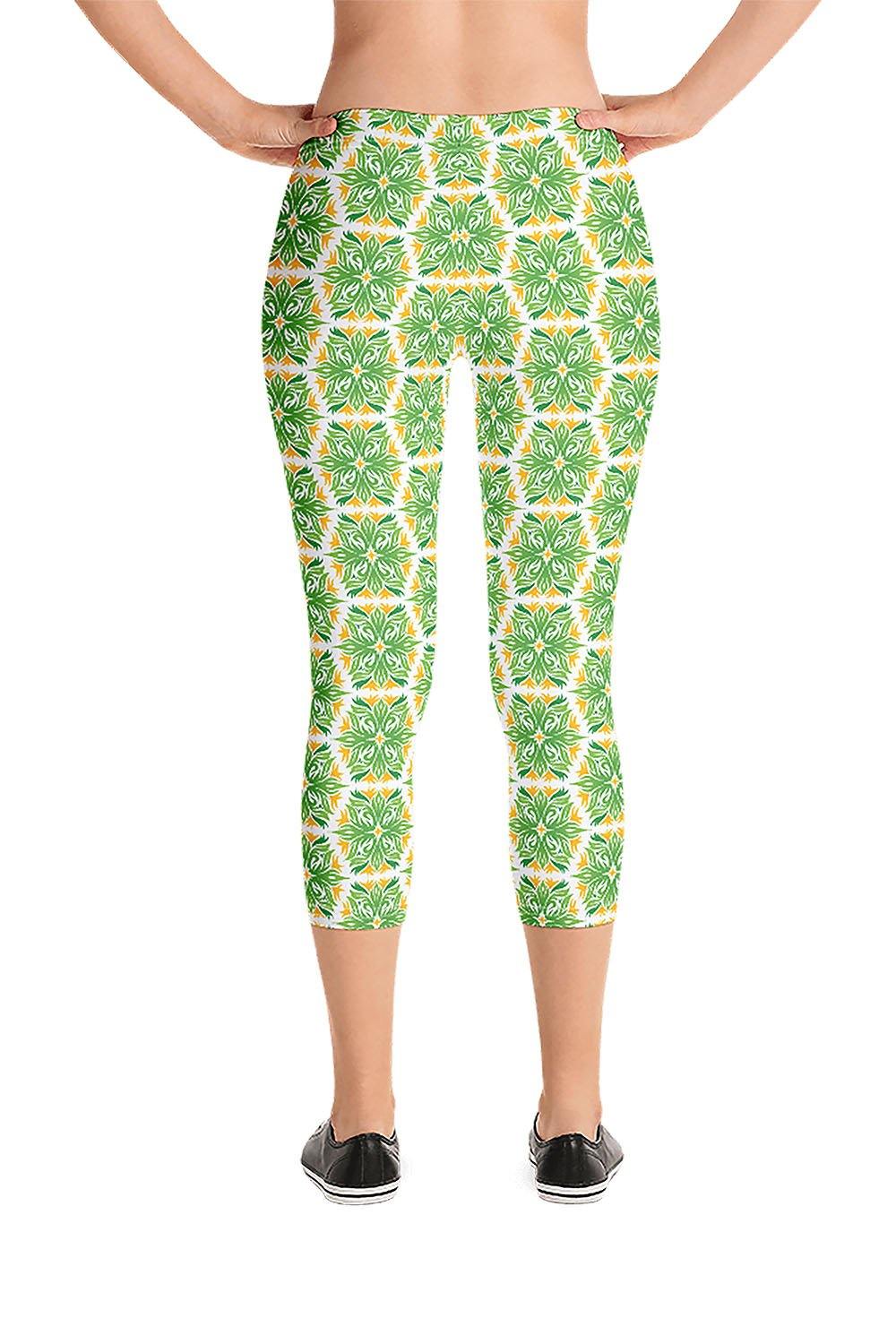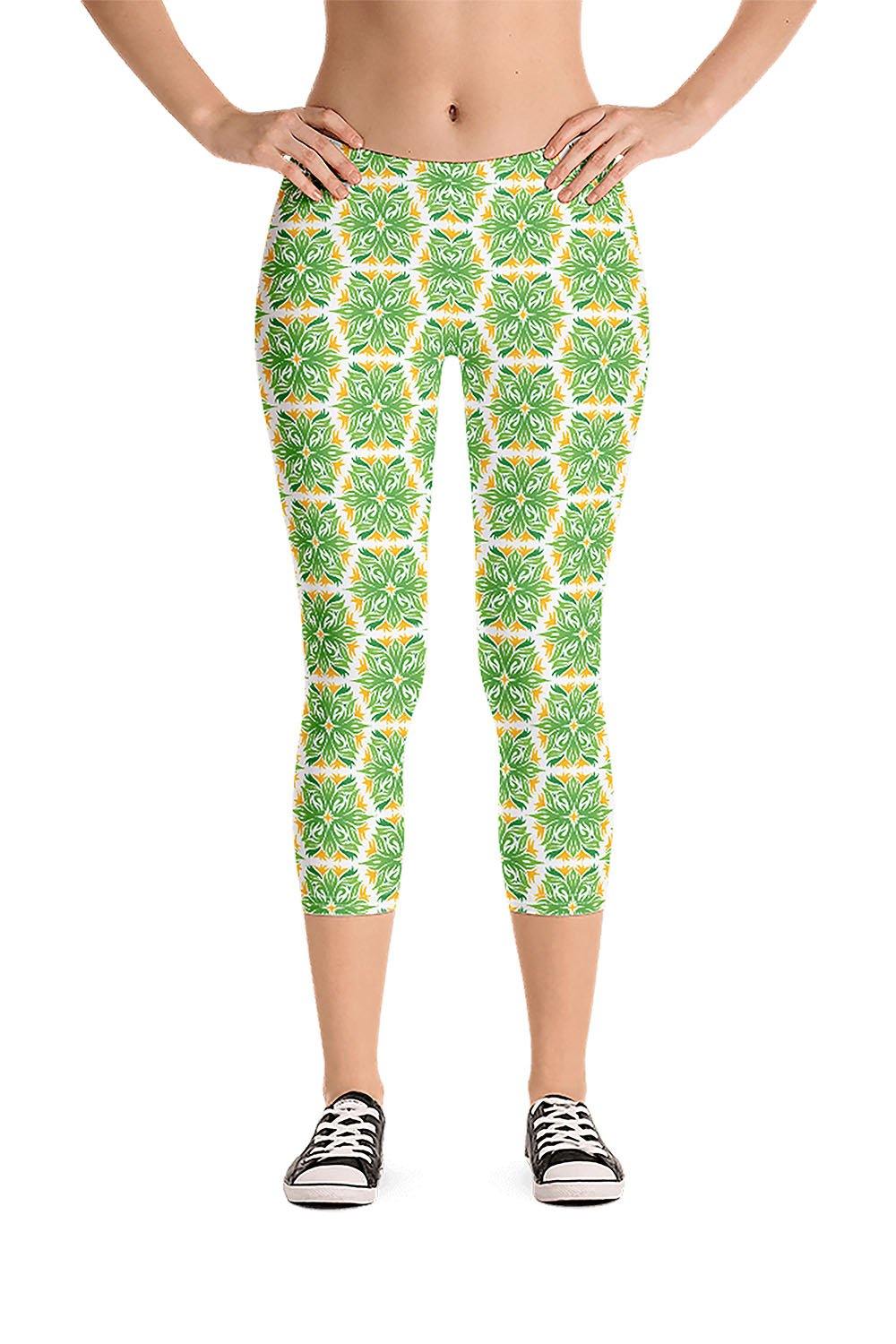 Foliage Capri Leggings - For this artwork, we created a foliage pattern that spreads across one leg then we mirrored the same pattern on the other leg to create a symmetrical pattern across the leggings. Picking foliage as the name of the leggings was derived from the simulation that the artwork represents. These wonderful green and orange leaves that demonstrate the nature's beauty. If you love nature then get these foliage capri leggings and add a touch of greenery to your wardrobe.