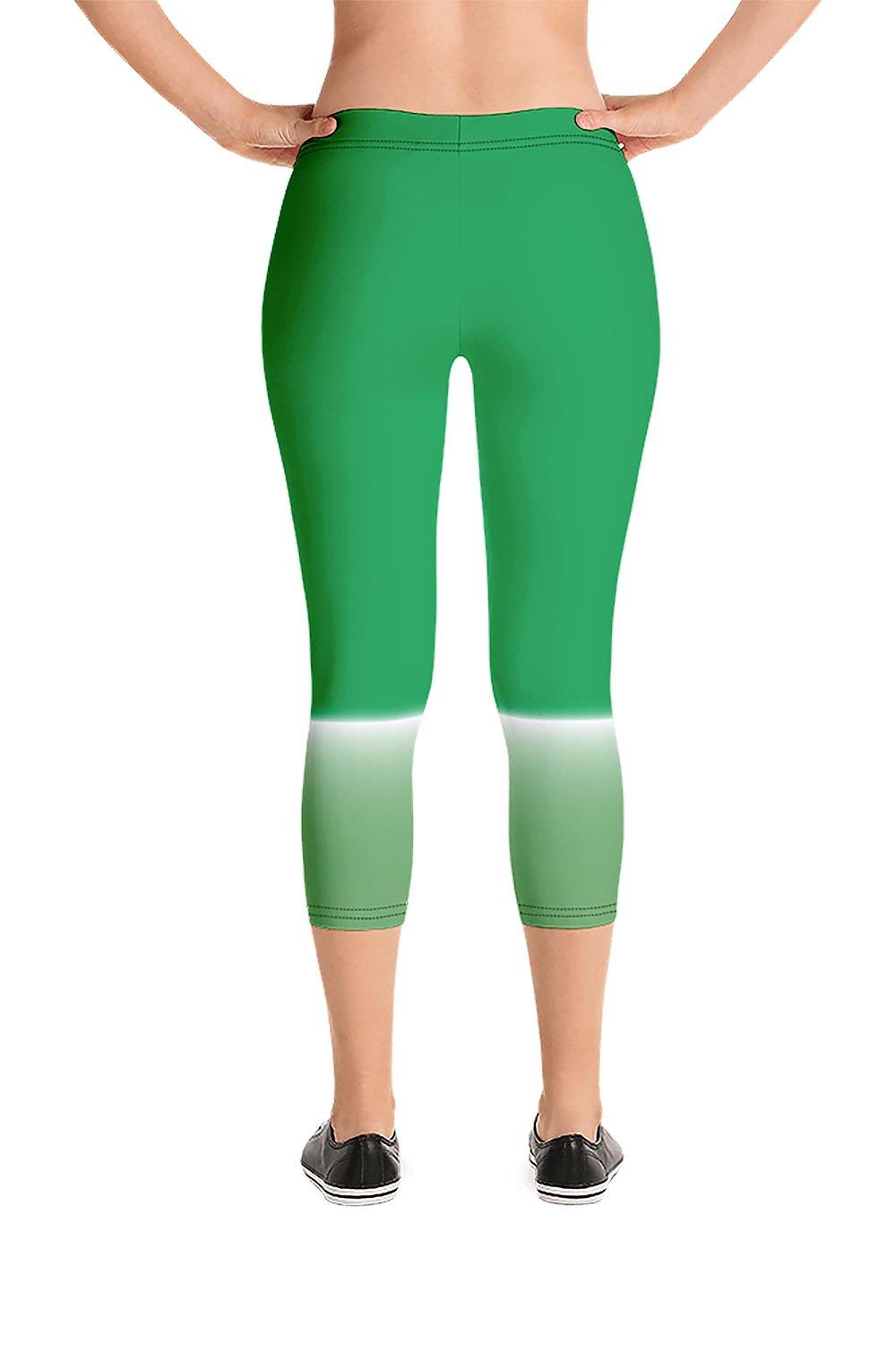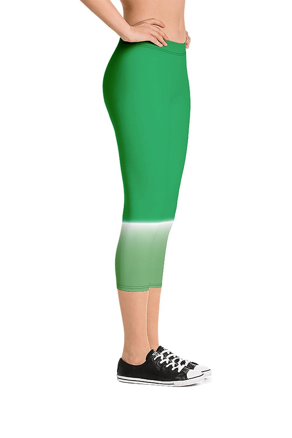 Meadow Capri Leggings - For this artwork, we chose a double tone, on the top we created a malachite green tone and a dull green tone at the bottom, then we separated the two by a white streak that spreads across the knees, giving the illusion of gradually filling the entire leggings with the top tone. Picking meadow as the name of the leggings was derived from the simulation that the artwork represents. The explosion of the green color all over the leggings ranging from deep rich green to light green is a perfect demonstration of a meadow. Vibrant, mesmerizing, and breath taking, these meadow capri leggings are perfect for nature lovers. Get these leggings and add a meadow to your wardrobe.