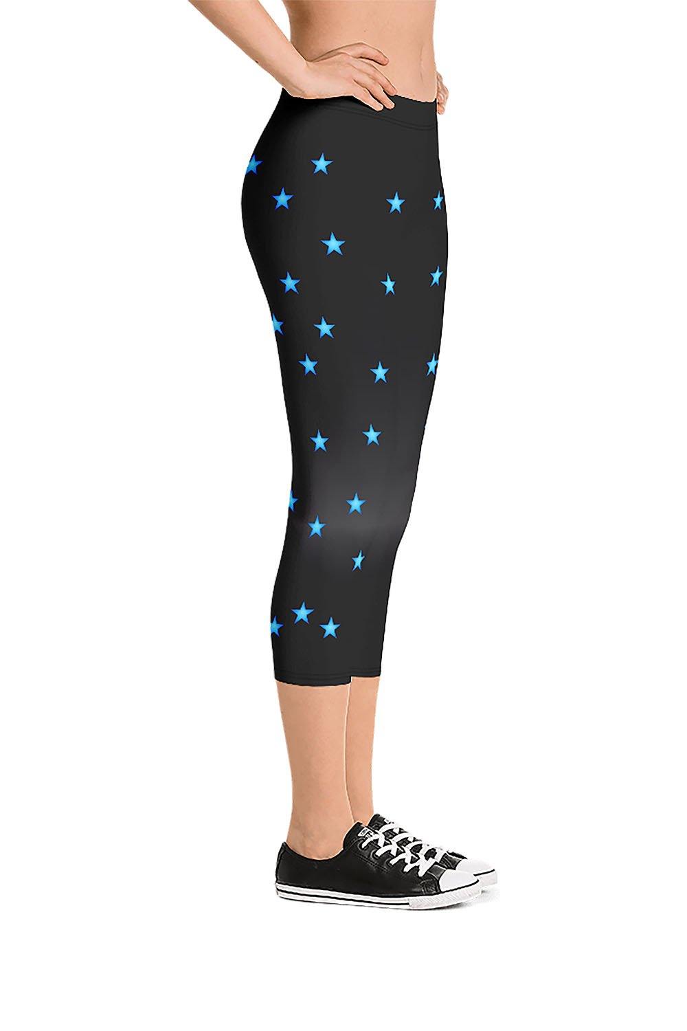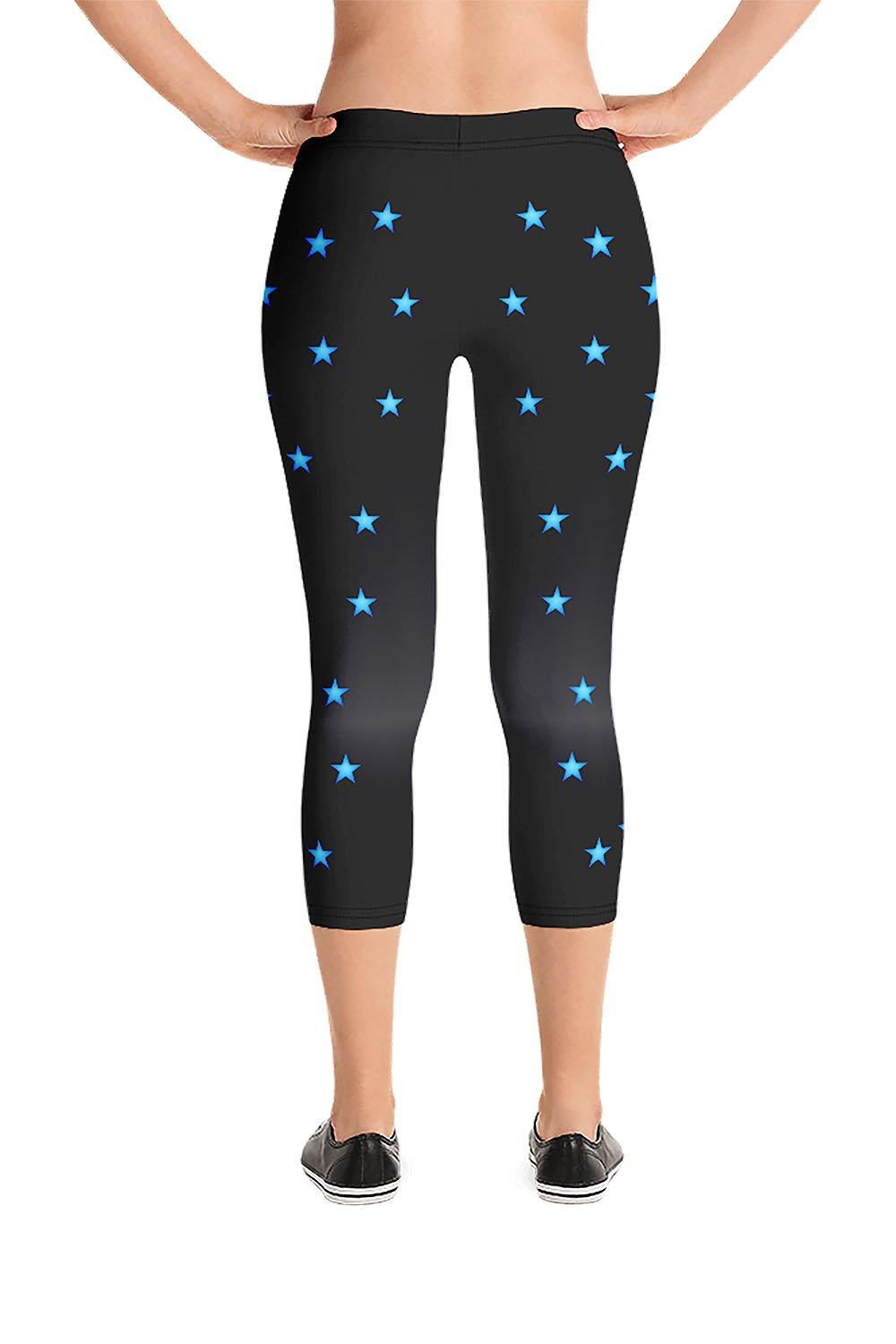 Night Sky Capri Leggings - For this artwork, we chose black as the main color of the leggings which is a gradient design that transitions from rich black to dark grey then to the same rich black tone. Then we scattered gradient blue stars all over the leggings. Picking night sky as the name of the leggings was derived from the simulation that the artwork represents. Black represents the night, and there is no more beautiful scenery than blue stars shinning and breaking the darkness of the night, mesmerizing the viewer. Grab these night sky capri leggings and add a piece of the night sky to your wardrobe.