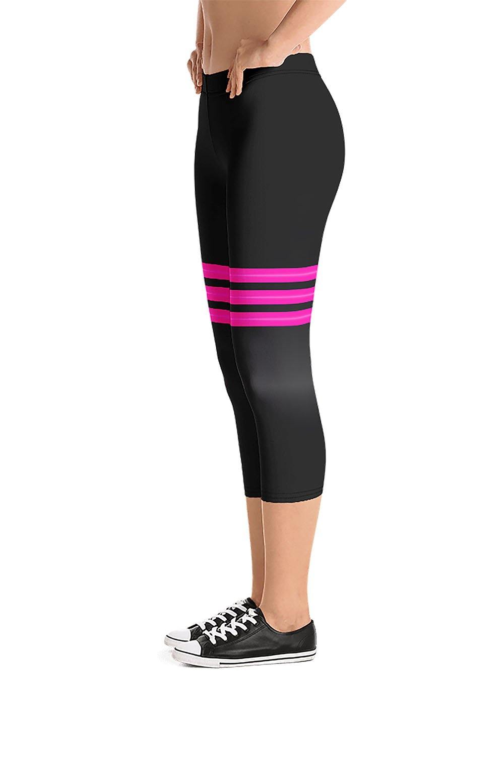 Triple Pink Stripes Black Capri Leggings - For this artwork, we chose black as the main color of the leggings which is a gradient design that transitions from rich black to dark grey then to the same rich black tone. Then horizontally across the thighs, we created 3 stripes, each stripe has a gradient design that transitions vertically from hot pink to a regular pink shade then to the same hot pink tone. These stylish capri leggings are perfect for the girls who love to mix dark colors with vivid/bright color tones, put them on and stand out in the crowd.
