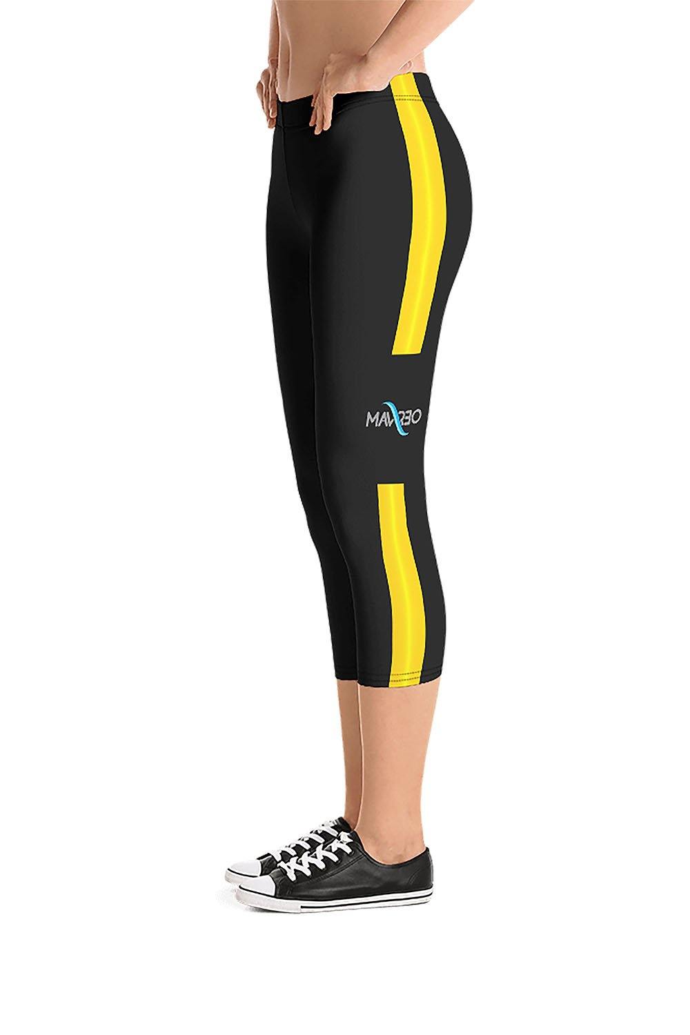 Yellow Stripe Mavreo Black Capri Leggings - For this artwork, we chose black as the main color of the leggings. Then vertically on both sides, we created 2 stripes, each stripe has a gradient design that transitions horizontally from golden yellow to a bright yellow shade then to the same golden yellow tone. On the left leg, we divided the stripe into two parts and placed our company logo (Mavreo). The idea behind this artwork is combining the night represented in black with the day represented in the sun-like colors of the stripe, giving you this vibrant and yet soothing and relaxing feeling. These chic capri leggings will certainly make you stand out in the crowd.