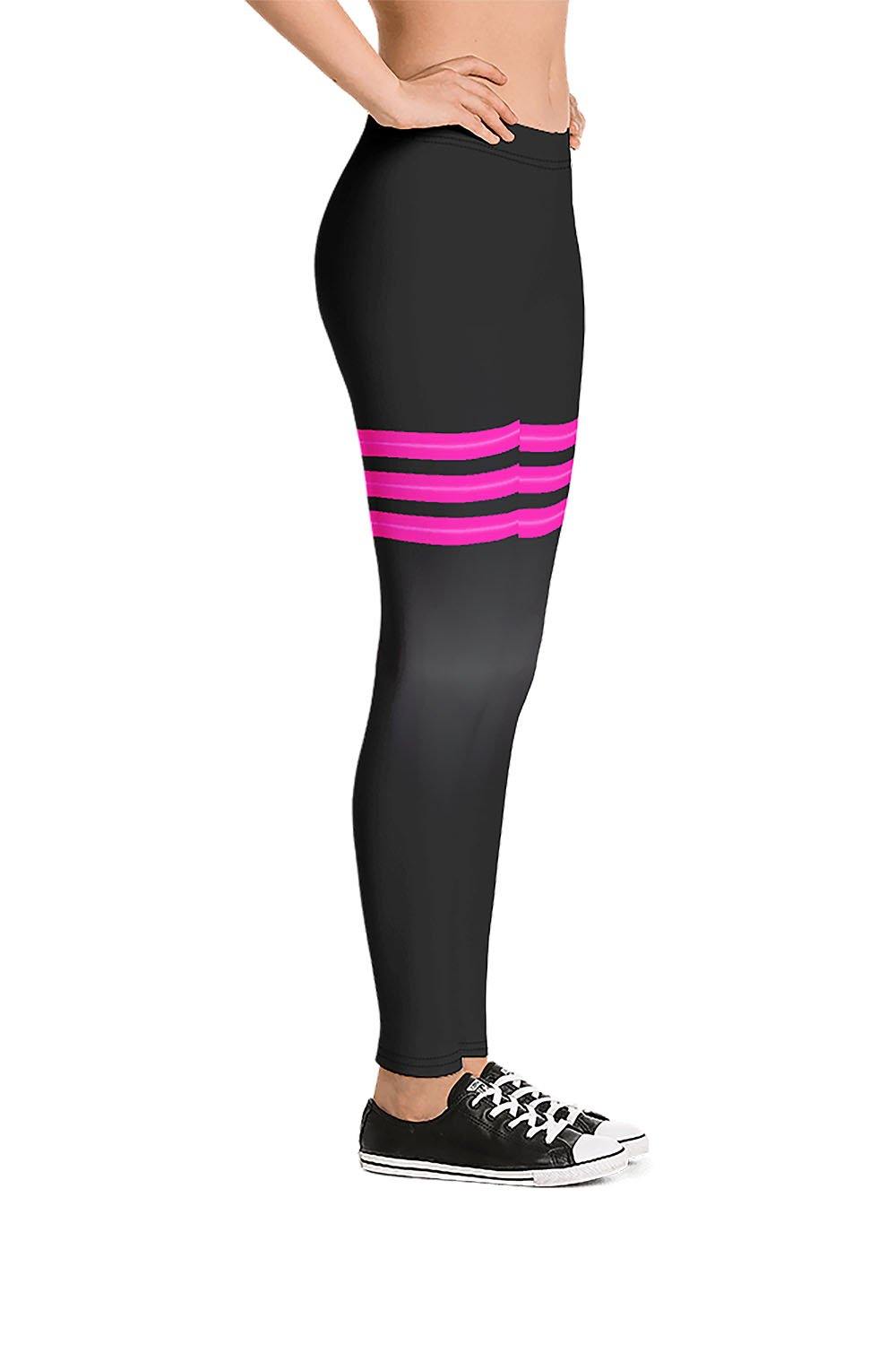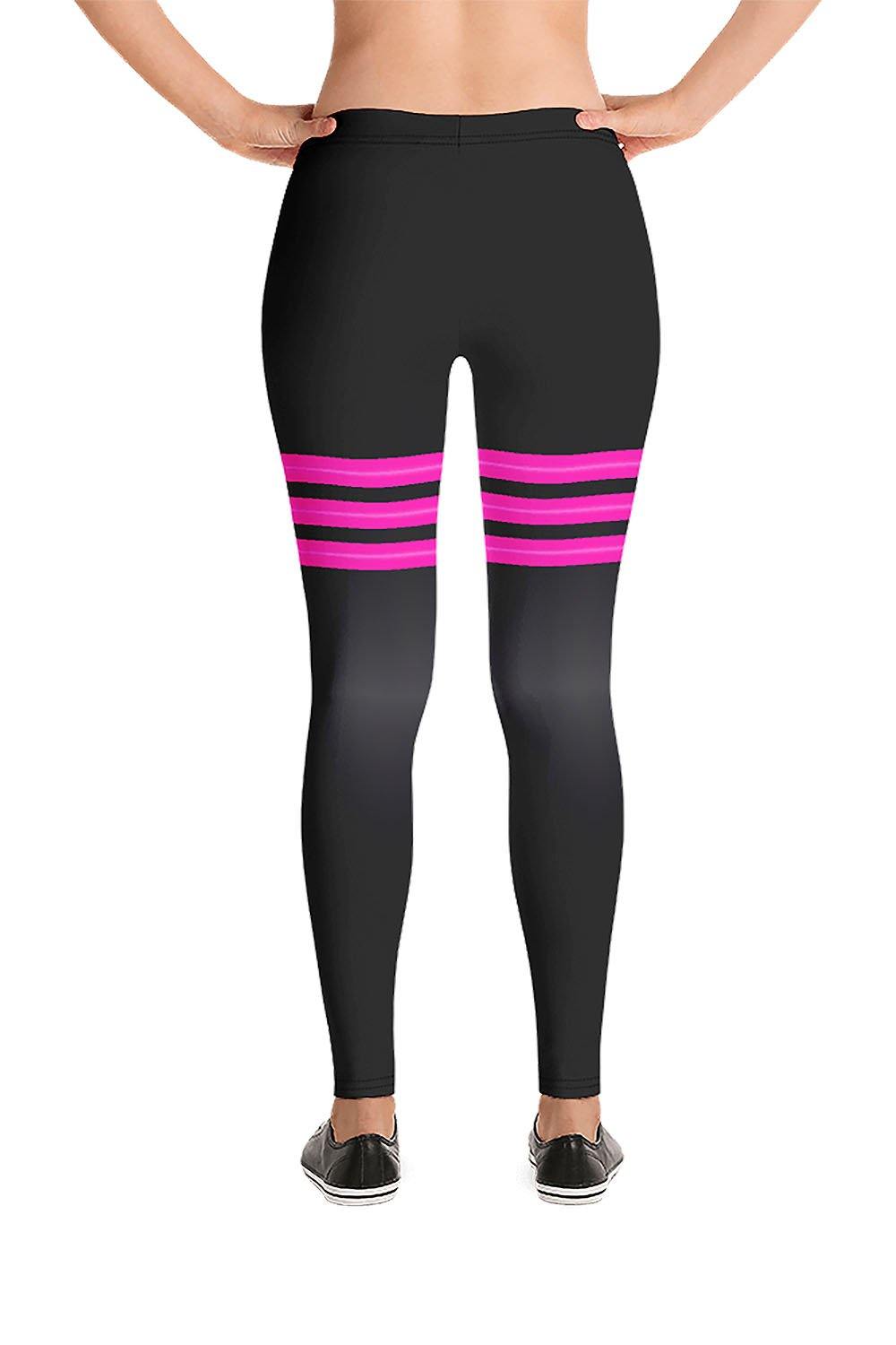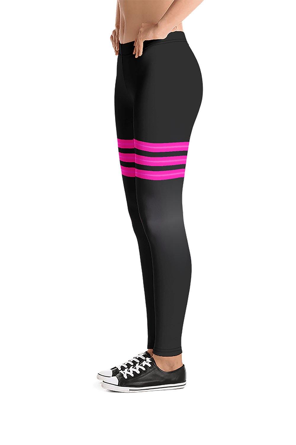 Triple Pink Stripes Black Leggings - For this artwork, we chose black as the main color of the leggings which is a gradient design that transitions from rich black to dark grey then to the same rich black tone. Then horizontally across the thighs, we created 3 stripes, each stripe has a gradient design that transitions vertically from hot pink to a regular pink shade then to the same hot pink tone. These stylish leggings are perfect for the girls who love to mix dark colors with vivid/bright color tones, put them on and stand out in the crowd.