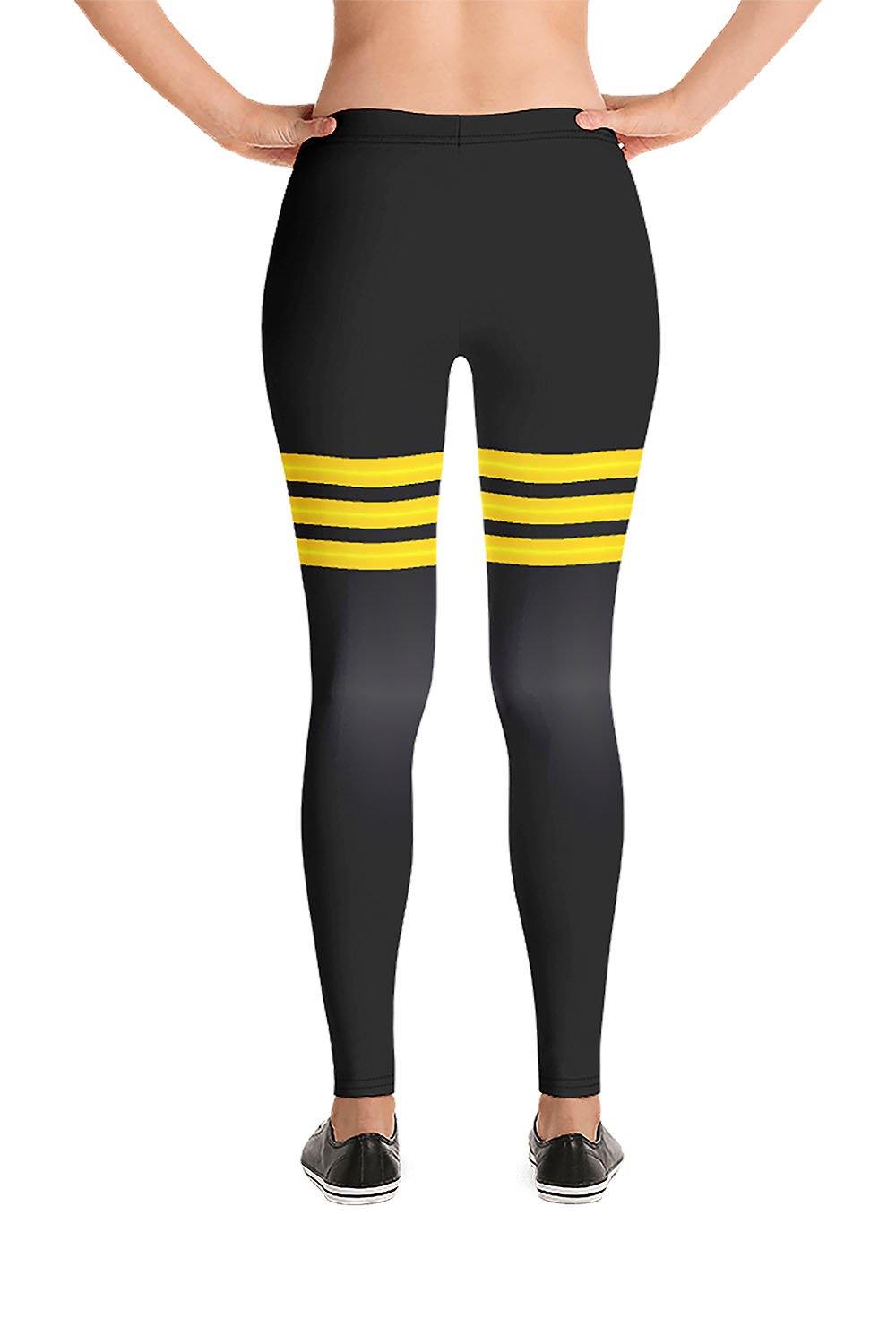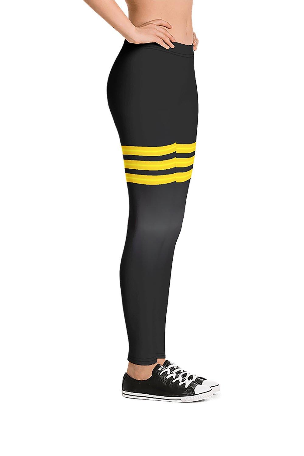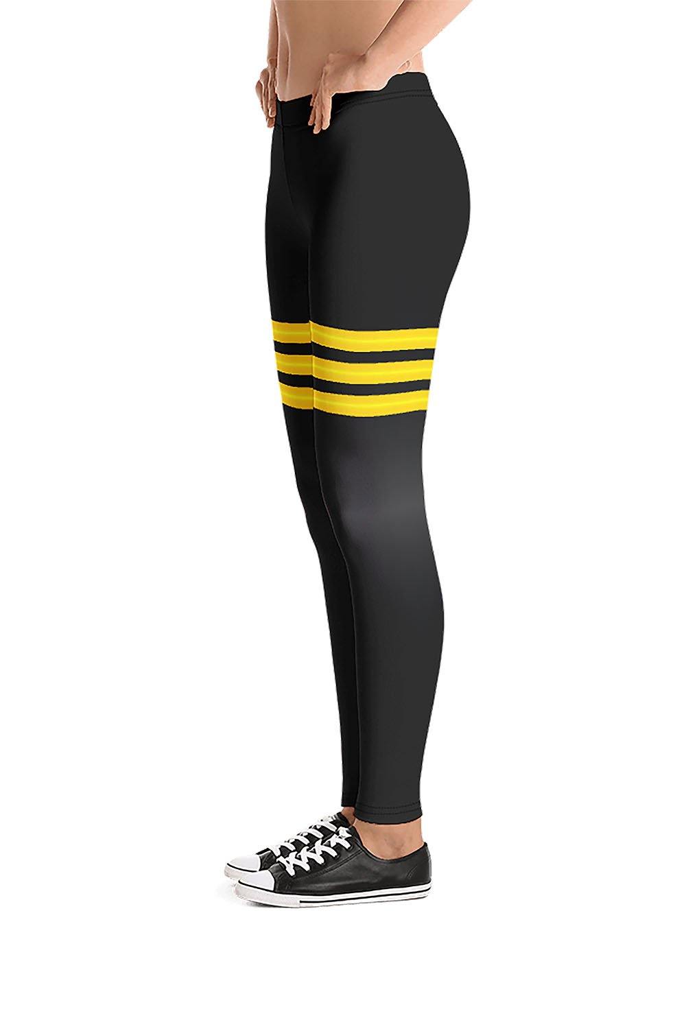Triple Yellow Stripes Black Leggings - For this artwork, we chose black as the main color of the leggings which is a gradient design that transitions from rich black to dark grey then to the same rich black tone. Then horizontally across the thighs, we created 3 stripes, each stripe has a gradient design that transitions vertically from golden yellow to a bright yellow shade then to the same golden yellow tone. The idea behind this artwork is combining the night represented in black with the day represented in the sun-like colors of the stripes, giving you this vibrant and yet soothing and relaxing feeling. These chic leggings will certainly make you stand out in the crowd.