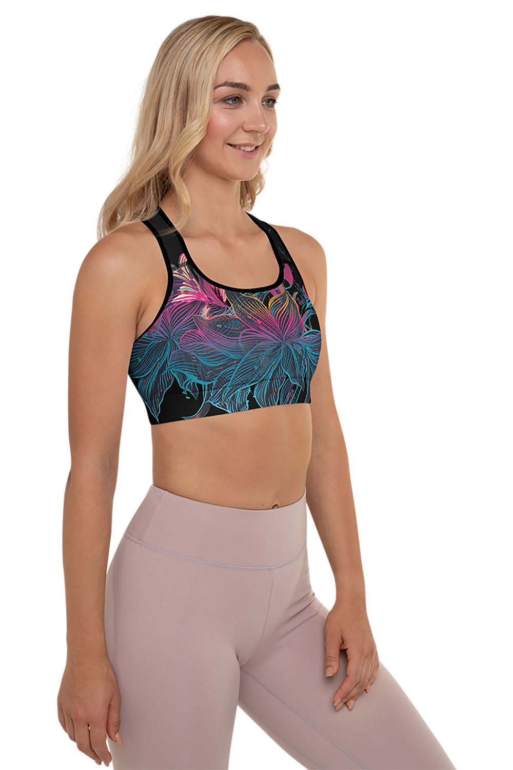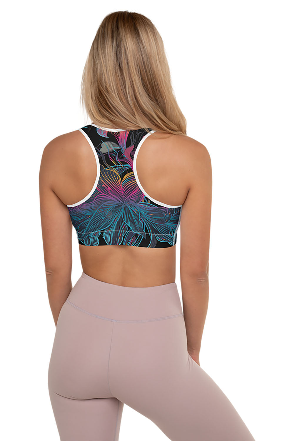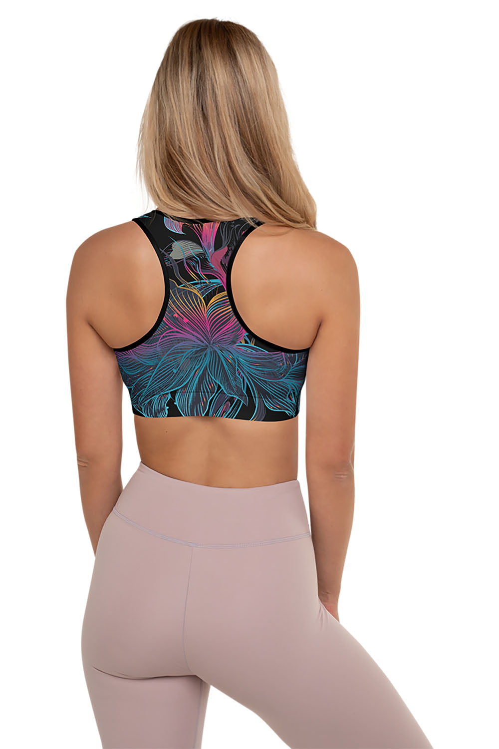 Floral Padded Sports Bra - For this artwork, we chose black as the main color of the sports bra. On top of it we created this wonderful floral illustration that spreads across the bra. This floral padded sports bra is sexy, elegant and with the floral design, it gives you a touch of nature.