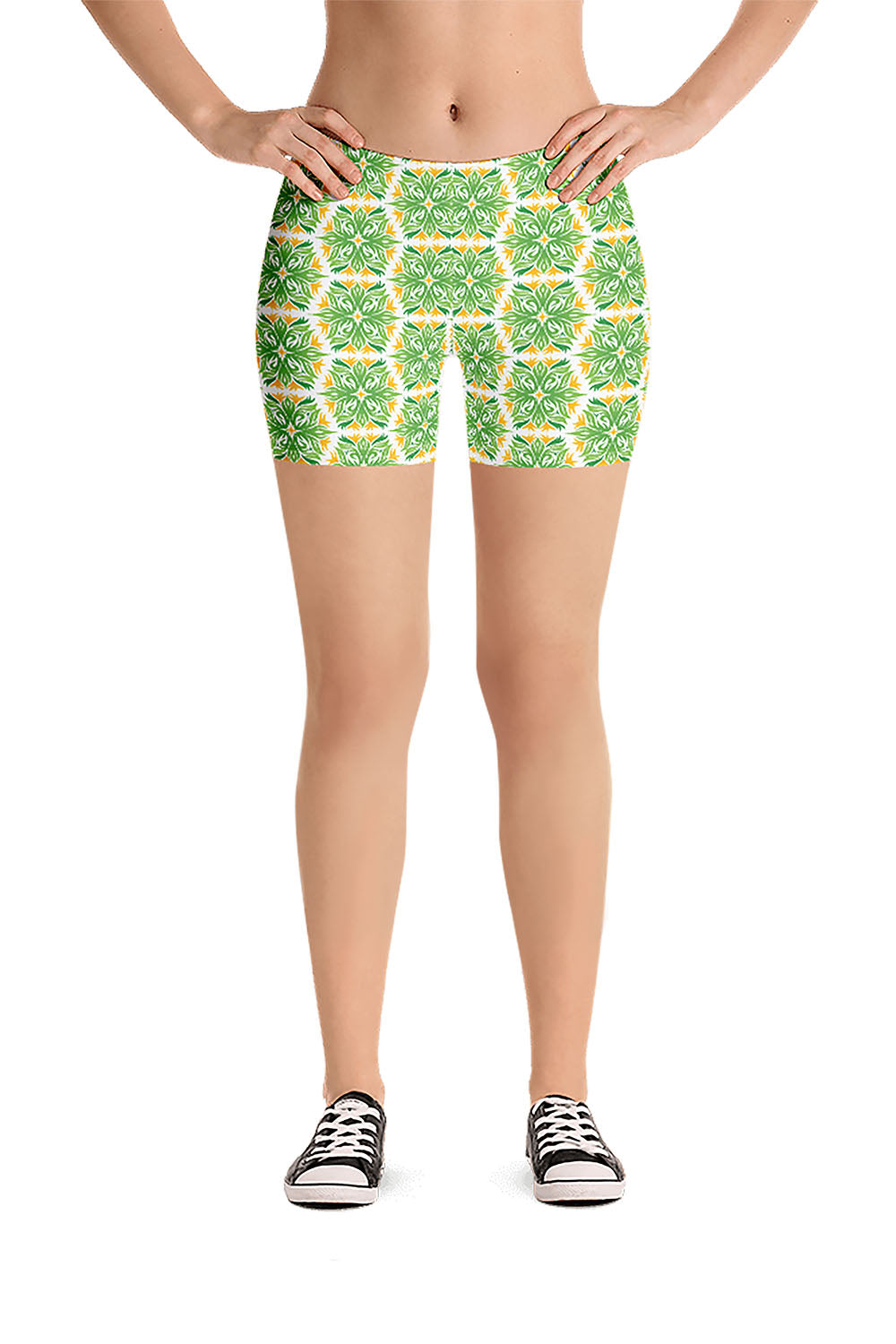 Foliage Shorts - For this artwork, we created a foliage pattern that spreads across one leg then we mirrored the same pattern on the other leg to create a symmetrical pattern across the shorts. Picking foliage as the name of the shorts was derived from the simulation that the artwork represents. These wonderful green and orange leaves that demonstrate the nature's beauty. If you love nature then get these foliage shorts and add a touch of greenery to your wardrobe.