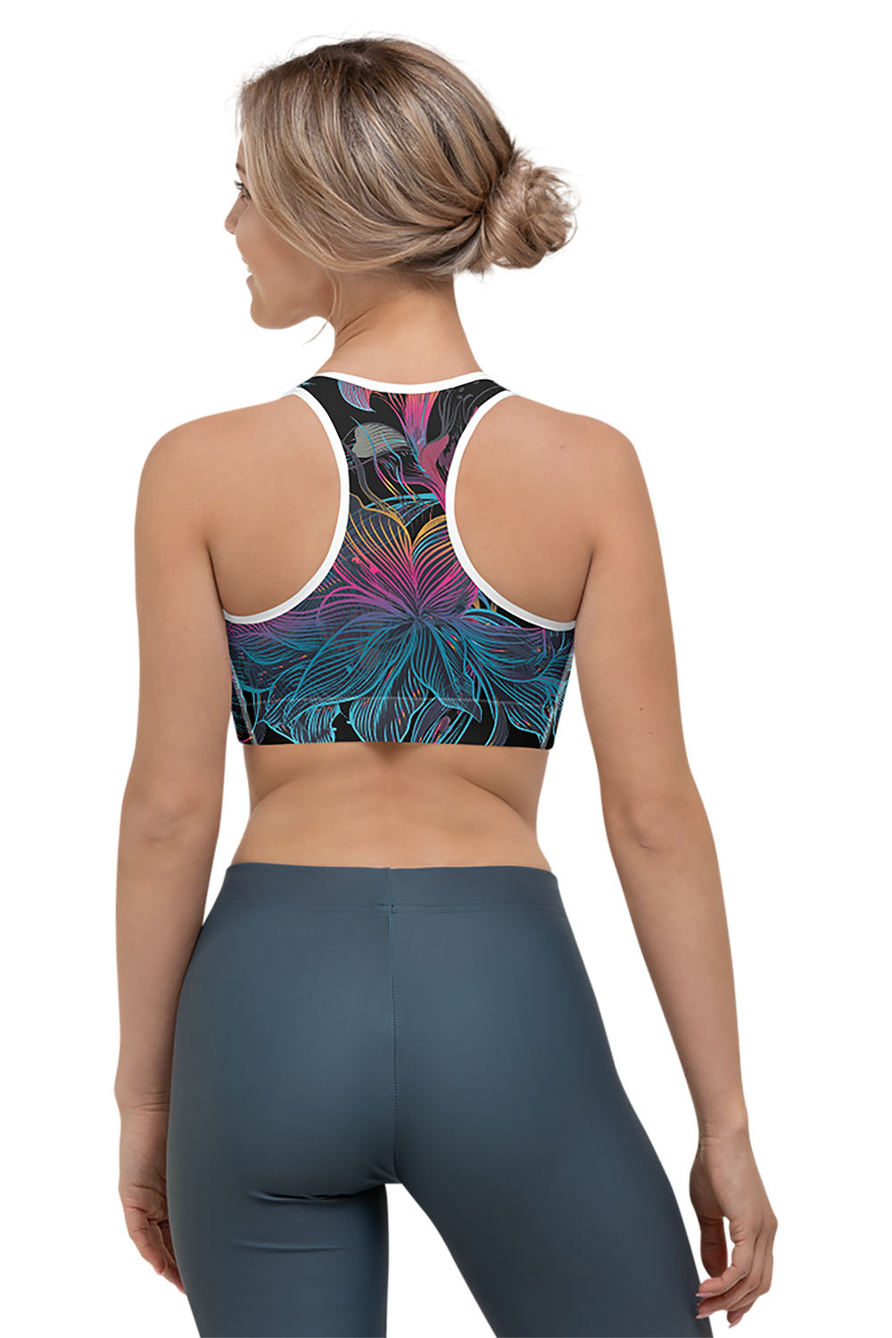 Floral Sports Bra - For this artwork, we chose black as the main color of the sports bra. On top of it we created this wonderful floral illustration that spreads across the bra. This floral sports bra is sexy, elegant and with the floral design, it gives you a touch of nature.