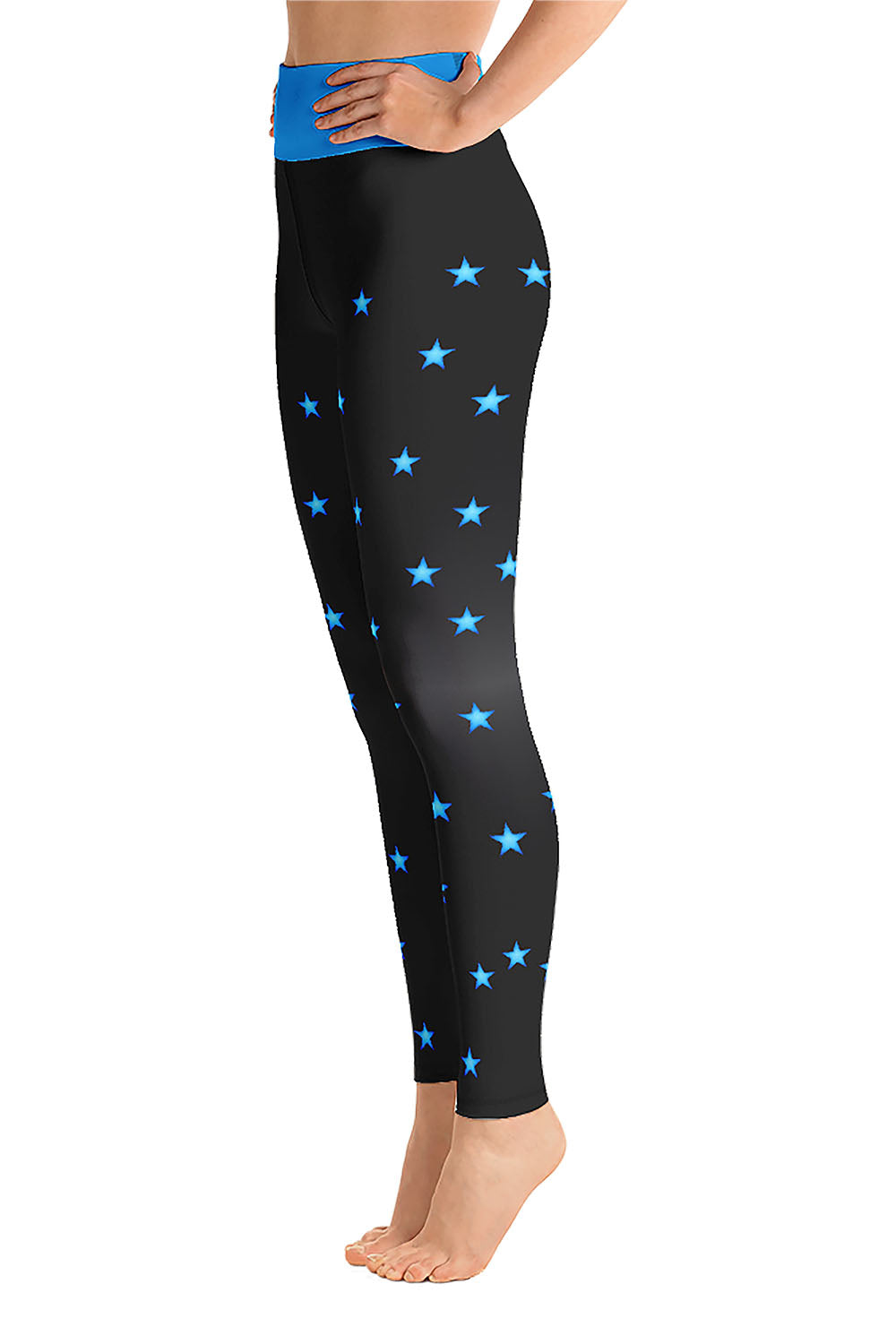 Night Sky Yoga Leggings - For this artwork, we chose black as the main color of the leggings which is a gradient design that transitions from rich black to dark grey then to the same rich black tone. Then we scattered gradient blue stars all over the leggings and then added a cerulean blue tone to the waistband to go with the color of the stars. Picking night sky as the name of the leggings was derived from the simulation that the artwork represents. Black represents the night, and there is no more beautiful scenery than blue stars shinning and breaking the darkness of the night, mesmerizing the viewer. Grab these night sky yoga leggings and add a piece of the night sky to your wardrobe.