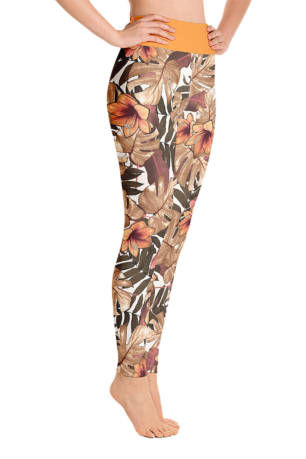 Orange Flower Yoga Leggings - This artwork is another addition to our floral designs. Check out our other floral designs (Floral Leggings & Pink Flower Leggings). The idea behind this artwork was derived from the fact that there is nothing that makes women happy more than flowers, and this time we designed orange flowers for the girls who love this color. We added a light orange tone to the waistband to go with the overall look of the leggings. Grab these orange flower yoga leggings and add a touch of nature to your wardrobe.