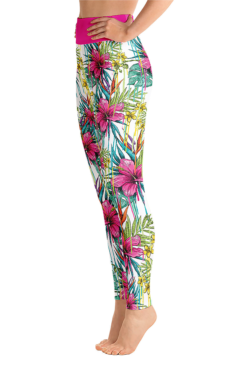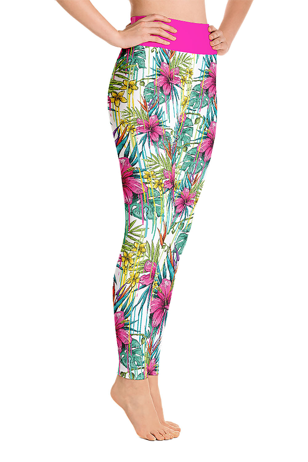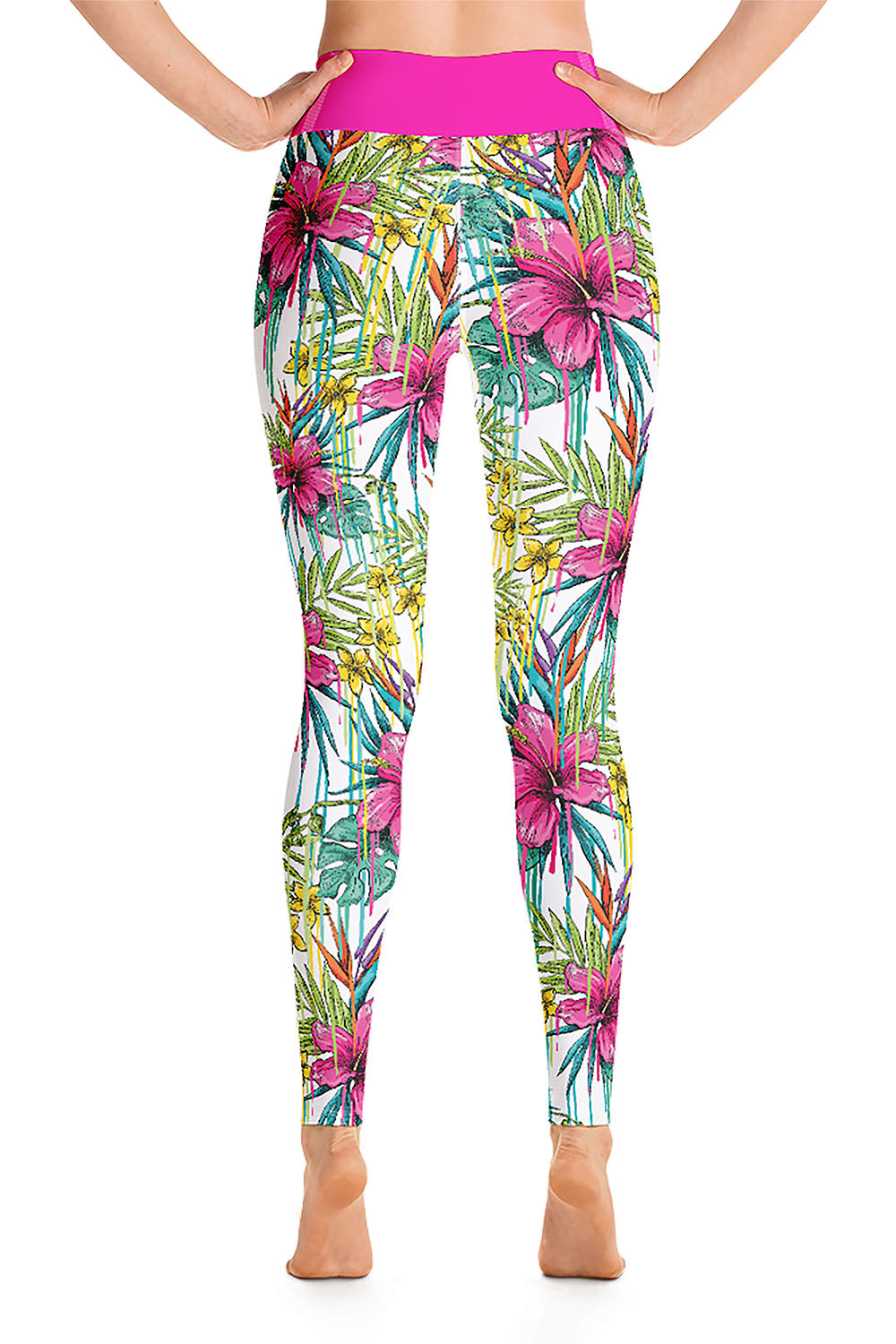 Pink Flower Yoga Leggings - The idea behind this artwork was derived from the fact that there is nothing that makes women happy more than flowers, add a pink touch to it and it will be the best gift any woman could ever have. We added a hot pink tone to the waistband to match the color of the flowers. Grab these pink flower yoga leggings and add a feminine touch to your wardrobe.