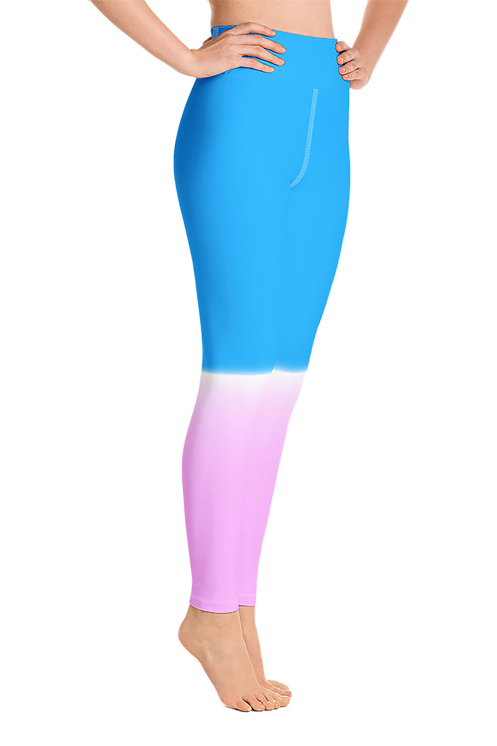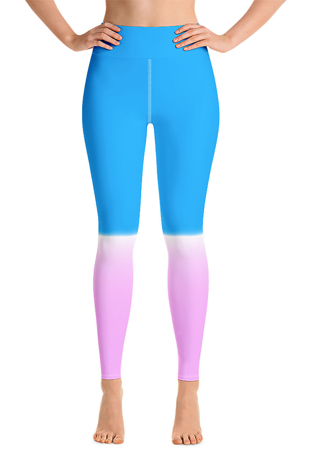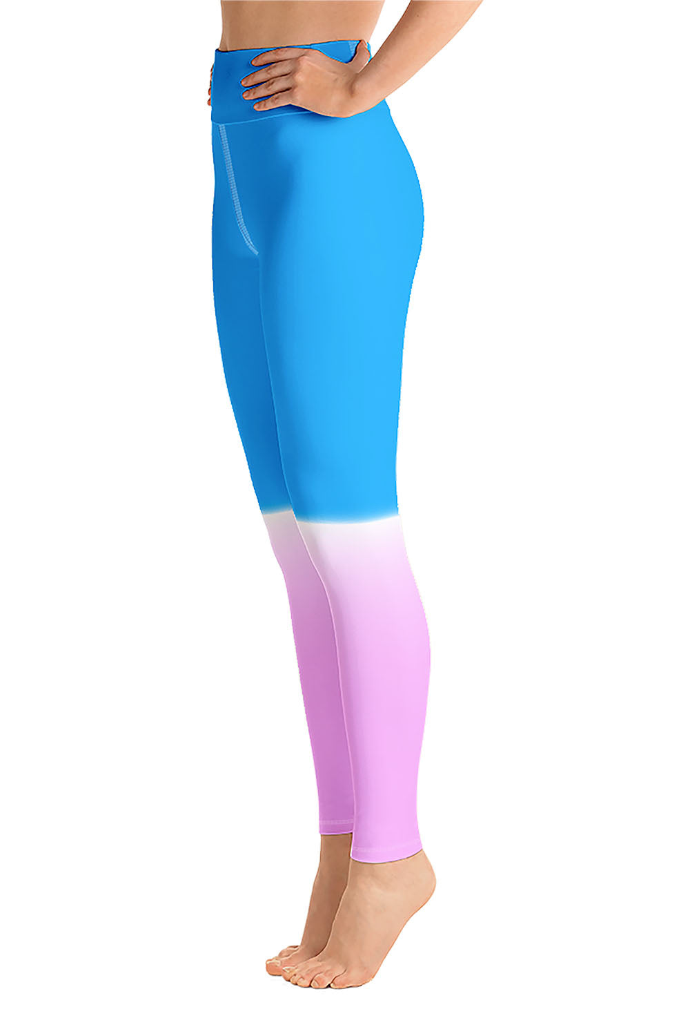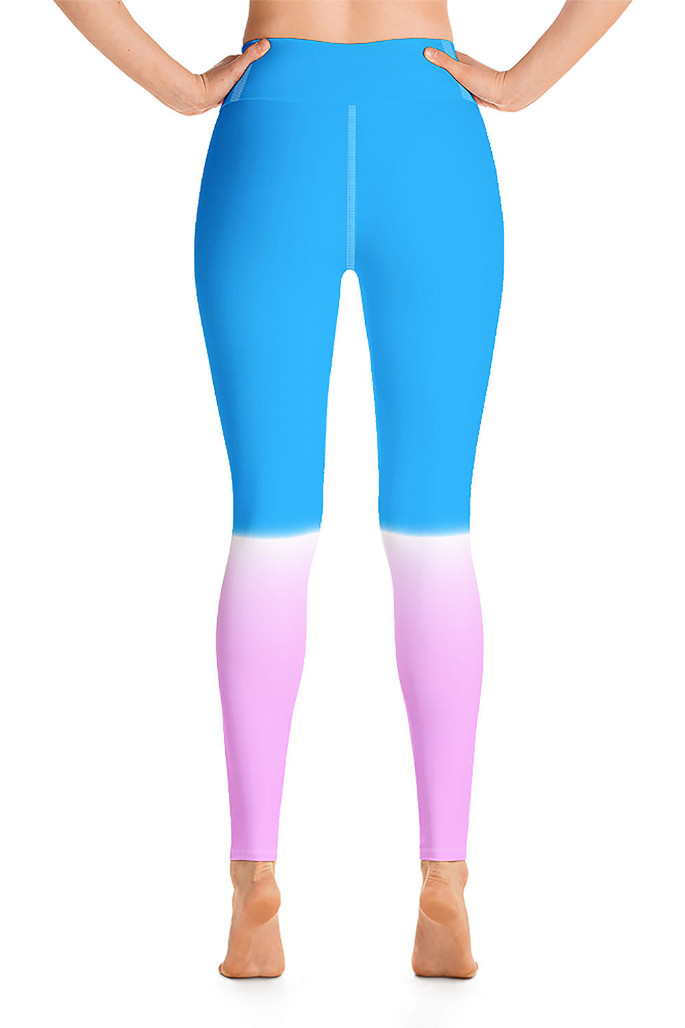 Popsicle Yoga Leggings - For this artwork, we chose a double tone, on the top we created a cerulean blue tone and a cool pink tone at the bottom, then we separated the two by a white streak that spreads across the knees, giving the illusion of gradually filling the entire leggings with the top tone. Picking popsicle as the name of the leggings was derived from the simulation that the artwork represents. A popsicle, aka " Ice Pop ", comes in a variety of colors/flavors, we chose blue and pink for this artwork because they are cheerful, eye candy and vibrant. Get these popsicle yoga leggings and add an ice pop to your wardrobe (Just don't be tempted to eat it).