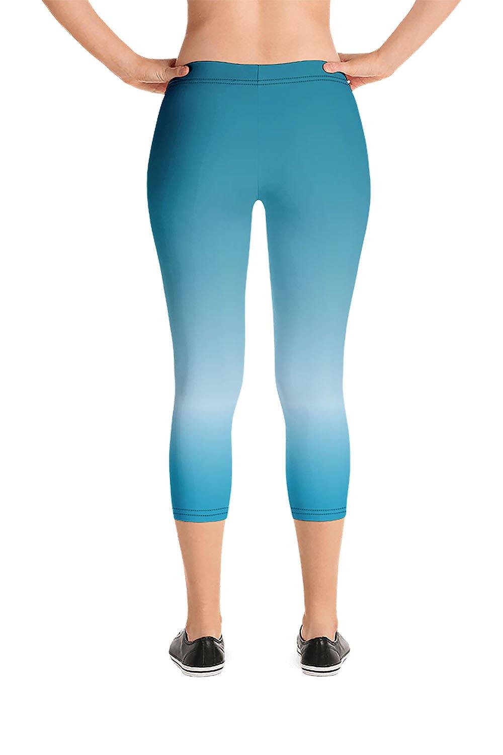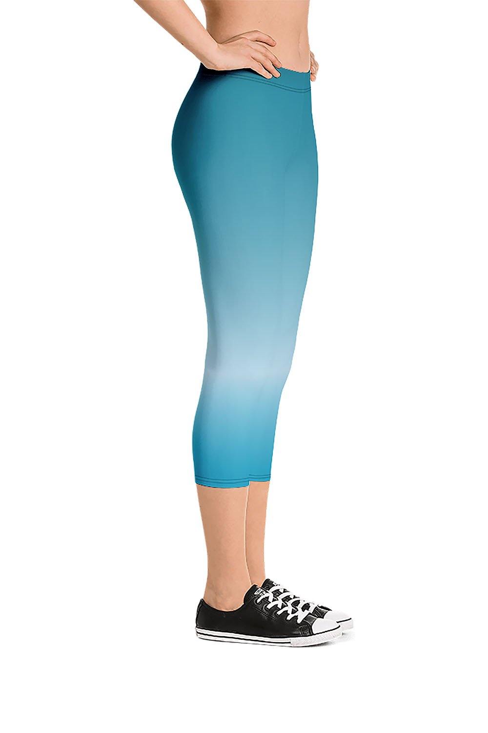Zircon Capri Leggings - The natural color of the zircon gemstone varies between colorless, red, brown, green, golden-yellow and blue. The blue zircon is not a pure blue color but rather a teal color, a mix of green and blue. For this design we chose a teal blue color which is teal but with more blue proportions. To simulate this beautiful gemstone, we created a gradient design that transitions from teal blue to a very light blue tone then to a lighter shade of teal blue as a manifestation of this beautiful gem. If zircon is your favorite gemstone, then grab these zircon capri leggings and add a gem to your wardrobe.