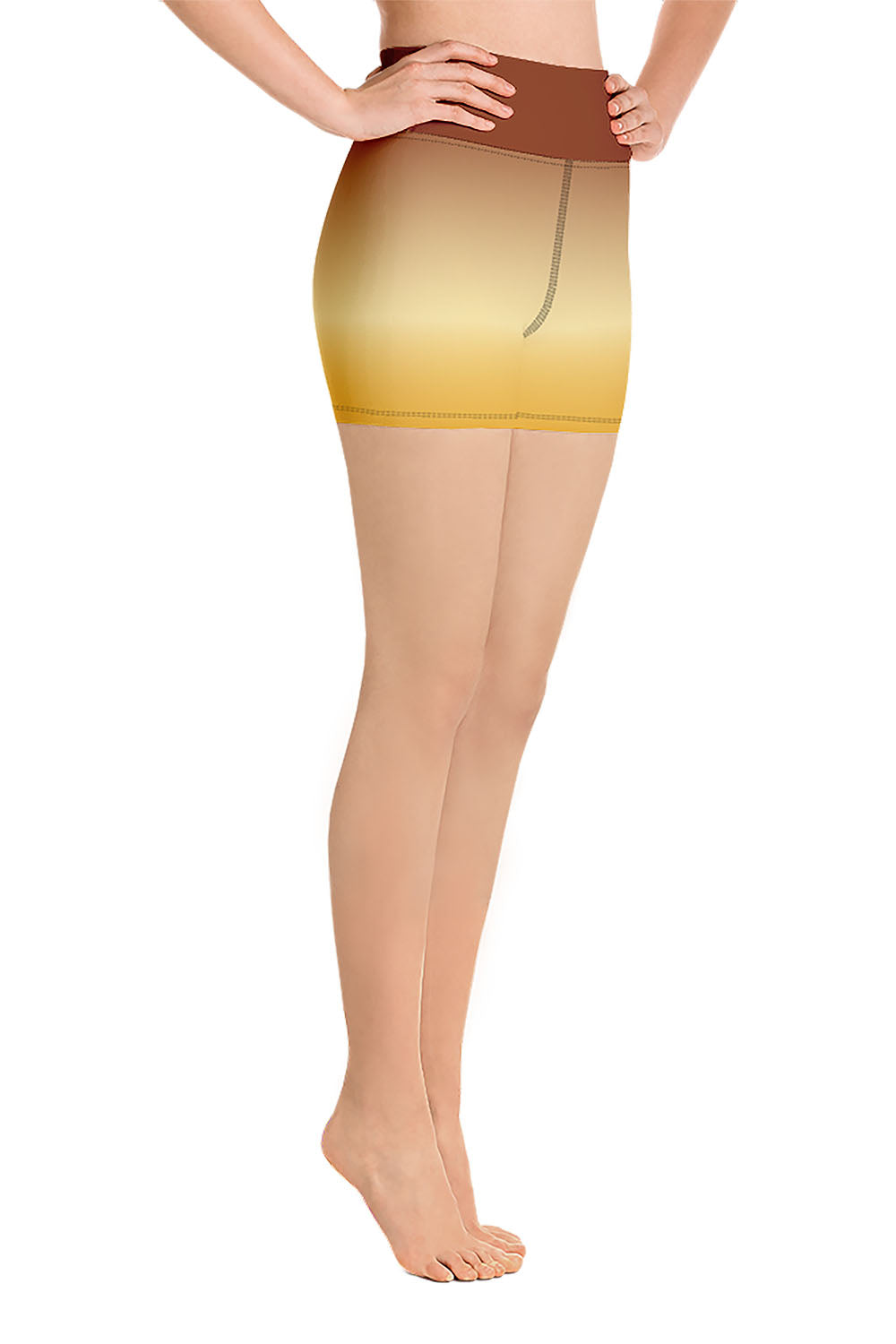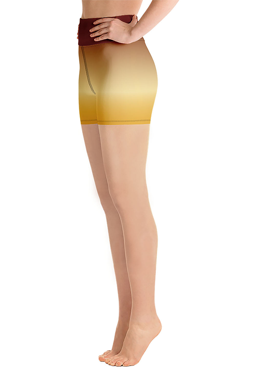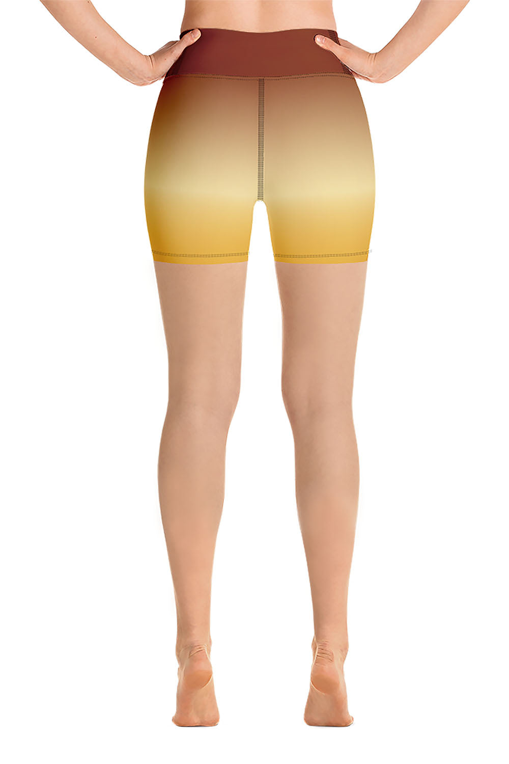 Citrine Yoga Shorts - Citrine is a gemstone of personal will, manifestation, and imagination. It's comforting, energizing, warm, and life giving. It stimulates the Chakras like the spring sunlight. Citrine is a yellow variety of quartz, ranging in color from pale to golden yellow, honey or almost brown. To simulate this beautiful gemstone, we created a gradient design that transitions from reddish brown to a pale yellow tinge then to golden yellow, close to orange tone as a manifestation of this energizing gem. If citrine is your favorite gemstone, then grab these citrine yoga shorts and add a gem to your wardrobe.