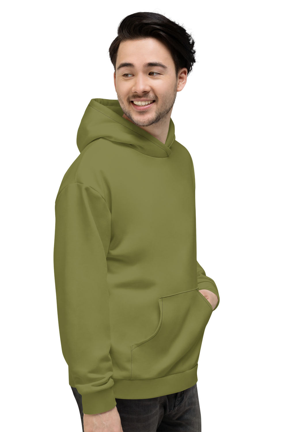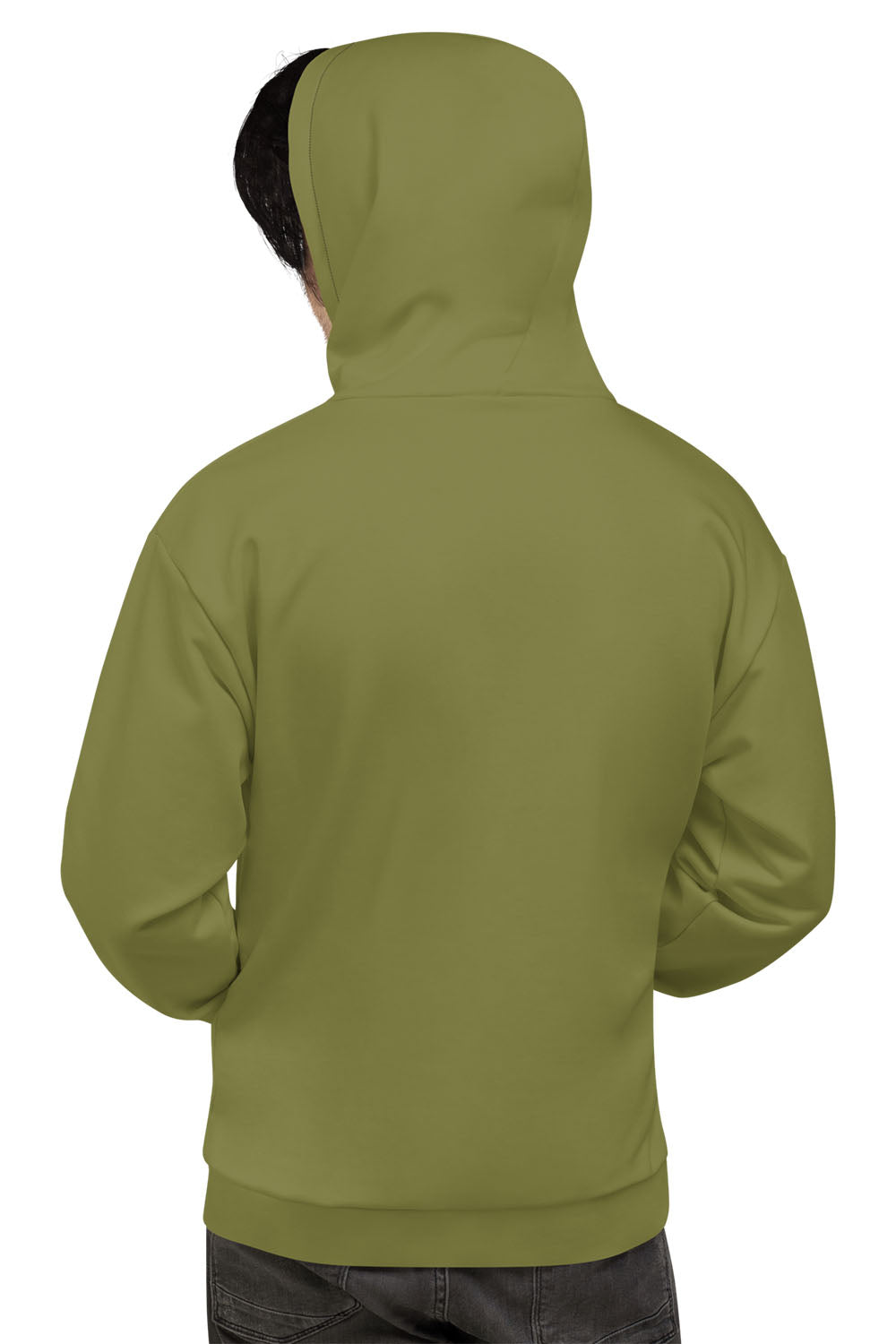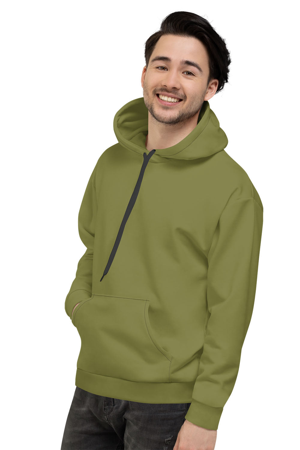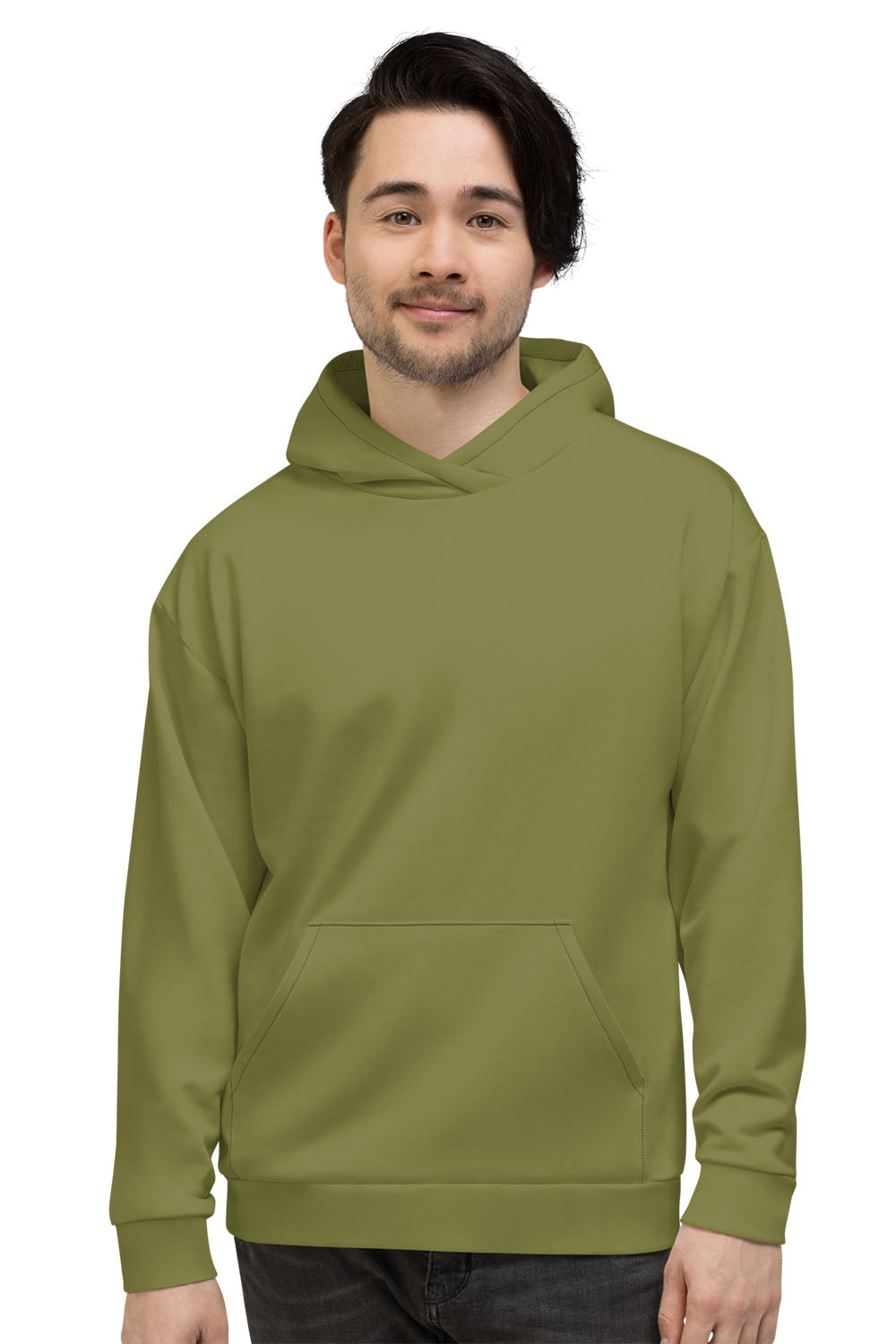Olive Green AOP Unisex Hoodie - Olive Green is one of the dark yellowish-green shades that sits between the warm yellow and the cooler green on the color wheel. Seen in camouflage print fabric and in military-style clothing. Olive green evokes wisdom and compassion and is also associated with harmony and diplomacy.